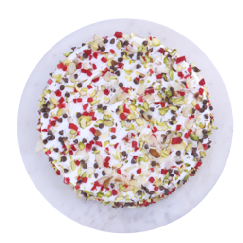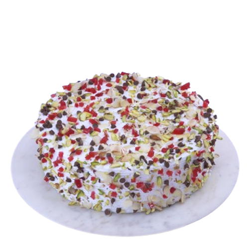 The topping has combination of crunchy cashews & vibrant pistachio add delightful crunch and a touch of nuttiness, and decadent chocolate chips creates a delightful contrast in flavours & complementing the overall taste of the cake with added tuti fruity gives a burst of fruity goodness along with sweetness and chewiness, introducing a delightful surprise with every bite.