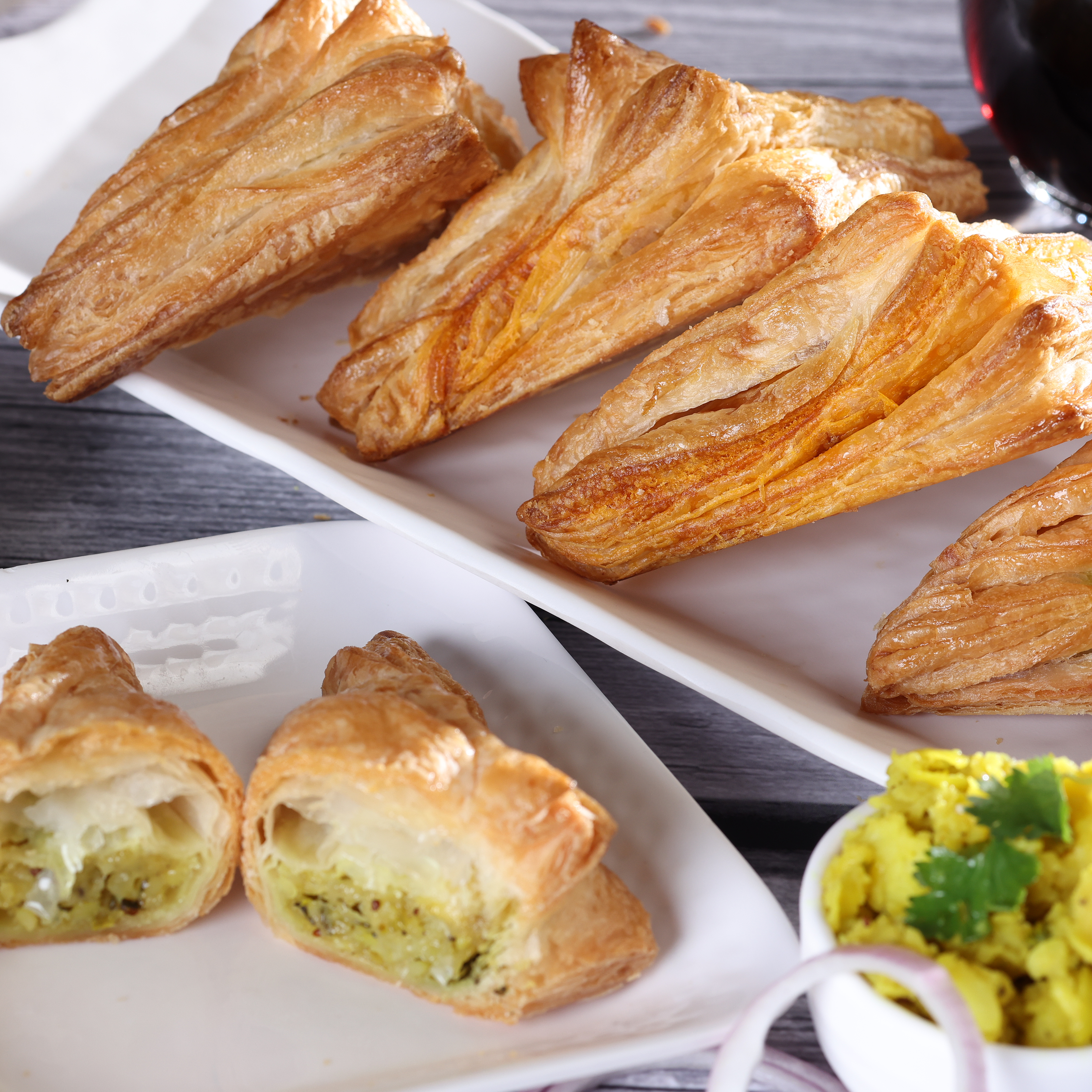 These crispy and flaky puff pastries are filled with a savoury mixture of seasoned potatoes and onions.